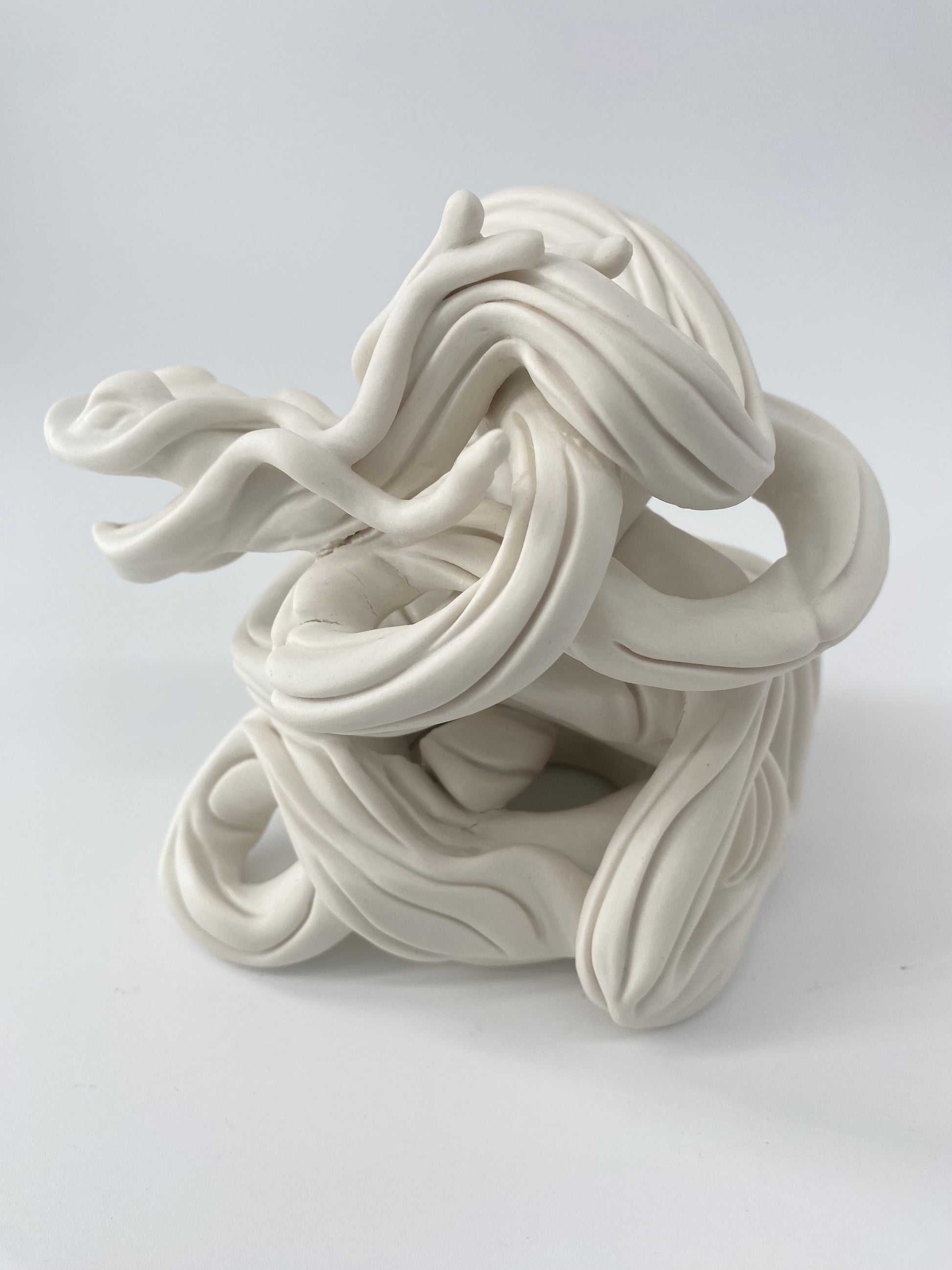 Modelée dans une porcelaine d’un blanc mat et profond, la sculpture évoque la peau souple et mouvante d’un être ancien.